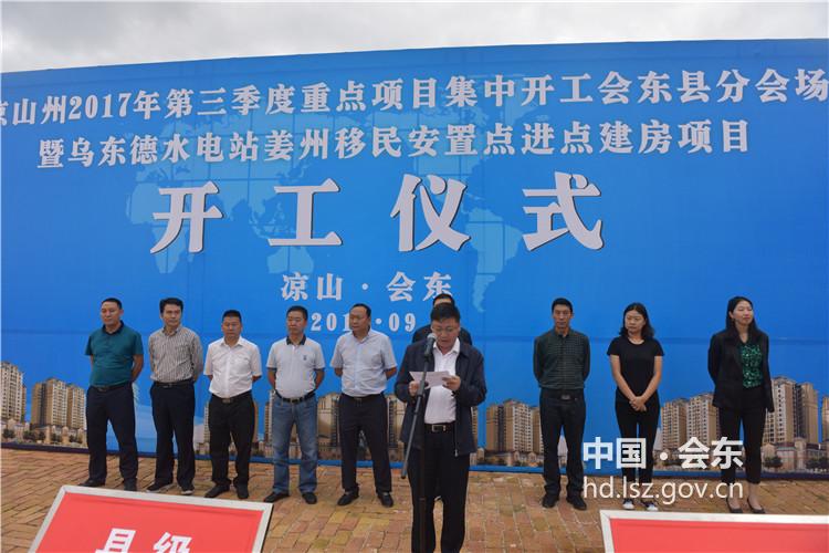 凉山州2017年第三季度重点项目集中开工会东分会场暨乌东德水电站姜州移民安置点进点建房项目举行开工仪式 集中开工项目15个总投资29.72亿元 9月28日上午,凉山州2017年第三季度重点项目集中开工会东分会场暨乌东德水电站姜州移民安置点进点建房项目开工仪式在姜州移民安置点举行。县委书记、县人大常委会主任刘晓博致辞并宣布开工,县委副书记、县长环江红主持仪式。